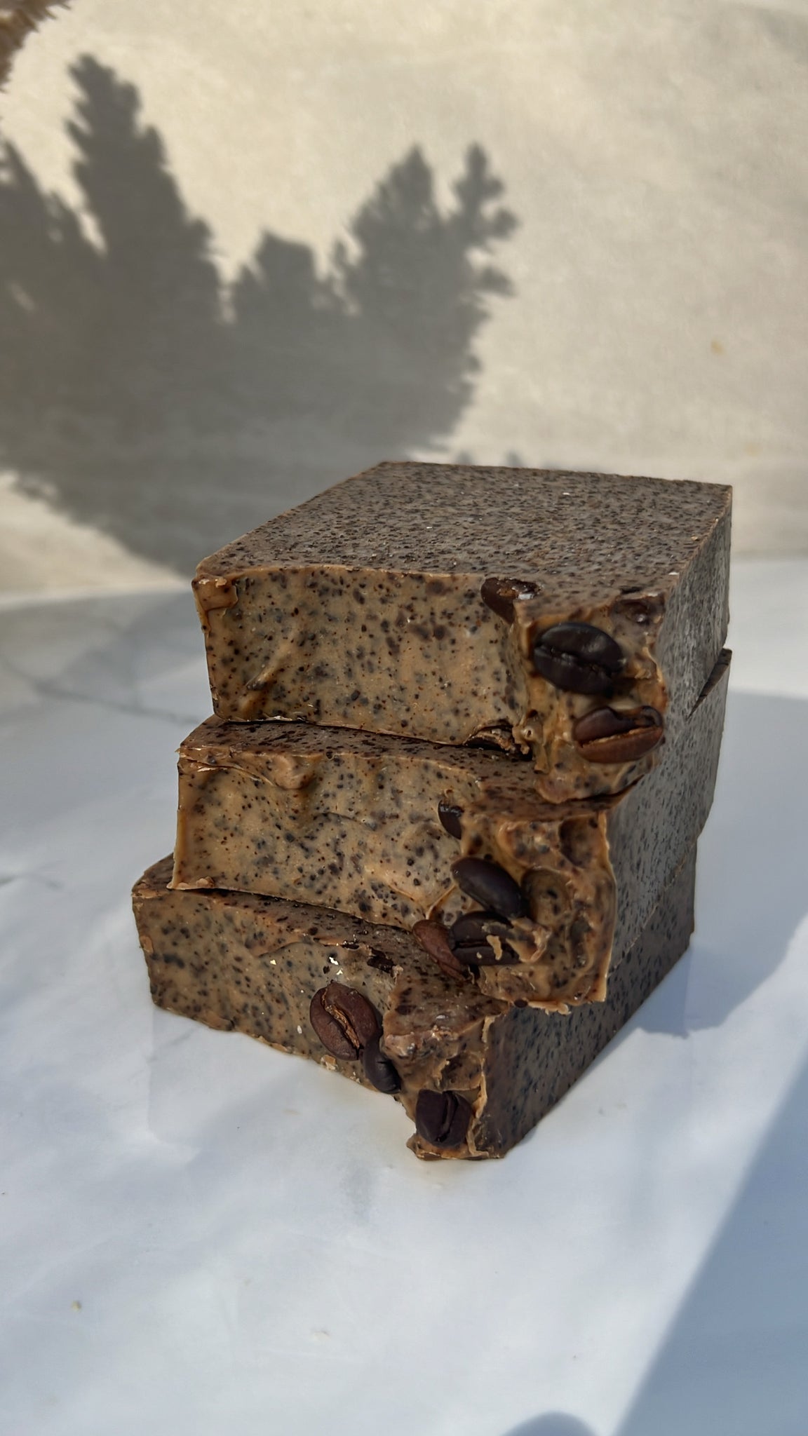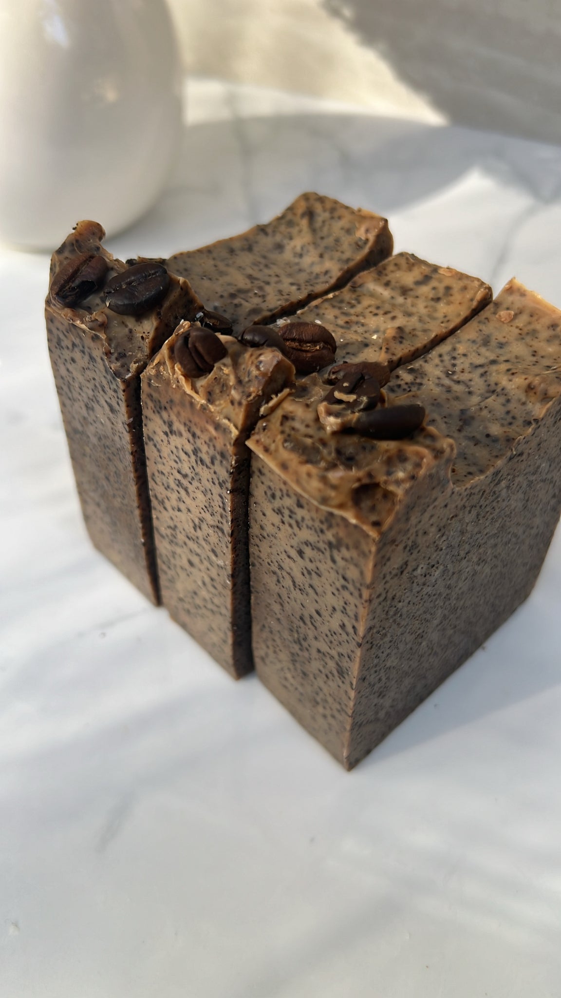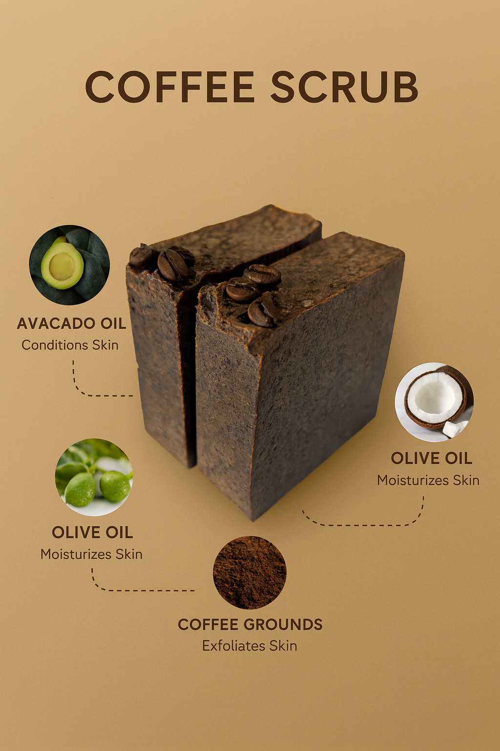 Handcrafted with olive oil, coconut oil, avocado oil, and real coffee grounds, it gently buffs away dryness while cleansing and deeply moisturizing.